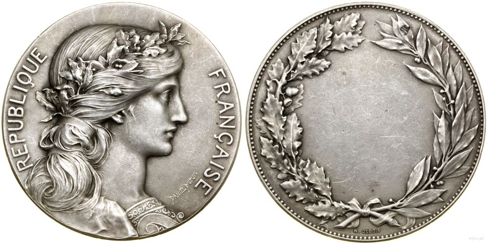 | Opis: | Francja - III Republika (1871–1940), medal nagrodowy, Aw: Popiersie Marianny w prawo, po prawej sygnatura DANIEL DUPUIS, REPUBLIQUE - FRANÇAISE, Rw: Wieniec, na dole sygnatura H. DUBOIS, Obrzeże: Punca 1ARGENT |
