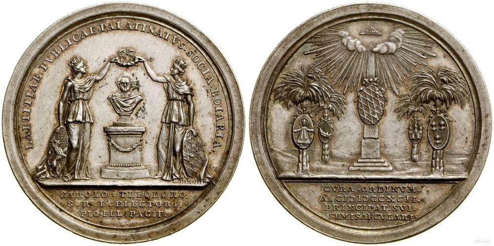 | Opis: | Niemcy - Pfalz-Sulzbach - Karol Teodor (1743–1799), medal z okazji 50. rocznicy objęcia urzędu księcia Jülich i Bergu, 1792, Aw: Palatyn i Bawaria trzymają wieniec laurowy nad władcą, LAETITIAE PVBLICAE PALATINATVS SOCIA BOIARIA, w odcinku CAROLO THEODORO..., Rw: Herb Bawarii na obelisku, otoczony czterema herbami na palmach, w odcinku u dołu CVRA ORDINVM A CLↃIↃCCXCII PRINCIPIAT SVI SEMISAECVLARI |