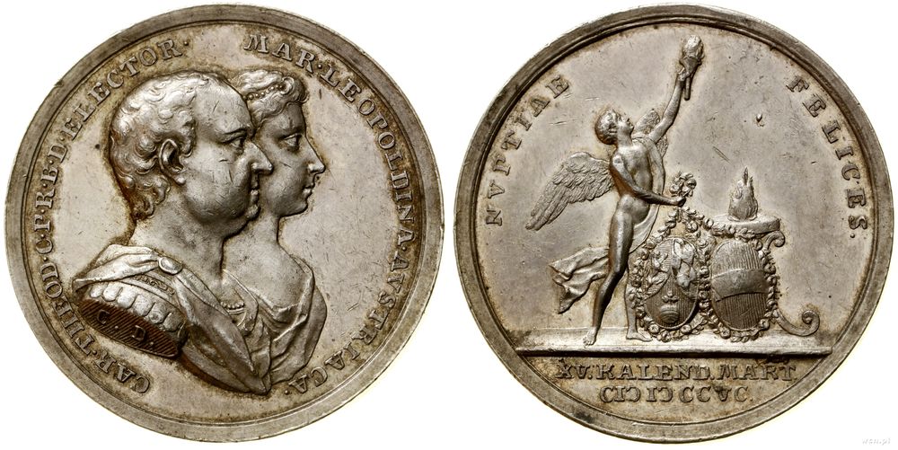 | Opis: | Niemcy - Pfalz-Sulzbach - Karol Teodor (1743–1799), medal wybity z okazji zaślubin z Marią Leopoldyną Habsburżanką, 1795, Aw: Popiersia w prawo, CAR THEOD C P R B D ELECTOR MAR LEOPOLDINA AVSTRIACA, Rw: Hymen, trzymając pochodnię w uniesionej lewej ręce, w prawej trzyma wieńce z herbami Palatynatu-Bawarii i Austrii, w tle ołtarz, NVPTIAE FELICES, w odcinku XV KALEND MART CIↃIↃCCVC |