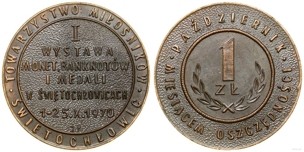 | Opis: | Polska - Polska Rzeczpospolita Ludowa (1952–1989), medal pamiątkowy, 1970, Aw: I / WYSTAWA / MONET, BANKNOTÓW / I MEDALI / W ŚWIĘTOCHŁOWICACH / 1-25.X.1970, TOWARZYSTWO MIŁOŚNIKÓW • ŚWIĘTOCHŁOWIC, Rw: Rewers monety 1 złoty, PAŹDZIERNIK - • MIESIĄCEM OSZCZĘDNOŚCI • |