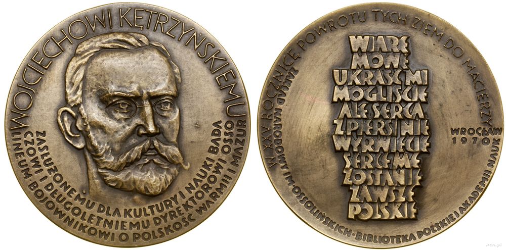 | Opis: | Polska - Polska Rzeczpospolita Ludowa (1952–1989), Wojciech Kętrzyński, 1970, Warszawa, Aw: Głowa lekko w prawo, WOJCIECHOWI KĘTRZYŃSKIEMU - ZASŁUŻONEMU DLA KULTURY I NAUKI BADA / CZOWI I DŁUGOLETNIEMU DYREKTOROWI OSSO / LINEUM • BOJOWNIKOWI O POLSKOŚĆ WARMII I MAZUR, Rw: WIARĘ / MOWIĘ / UKRAŚĆ MI / MOGLIŚCIE / ALE SERCA / Z PIERSI NIE / WYRWIECIE / SERCE ME / ZOSTANIE / ZAWSZE / POLSKIE, W XXV ROCZNICĘ POWROTU TYCH ZIEM DO MACIERZY - WROCŁAW / 1970 - ZAKŁAD NARODOWY IM • OSSOLIŃSKICH • BIBLIOTEKA POLSKIEJ AKADEMII NAUK, projektował i wykonał Bernard Lewiński |