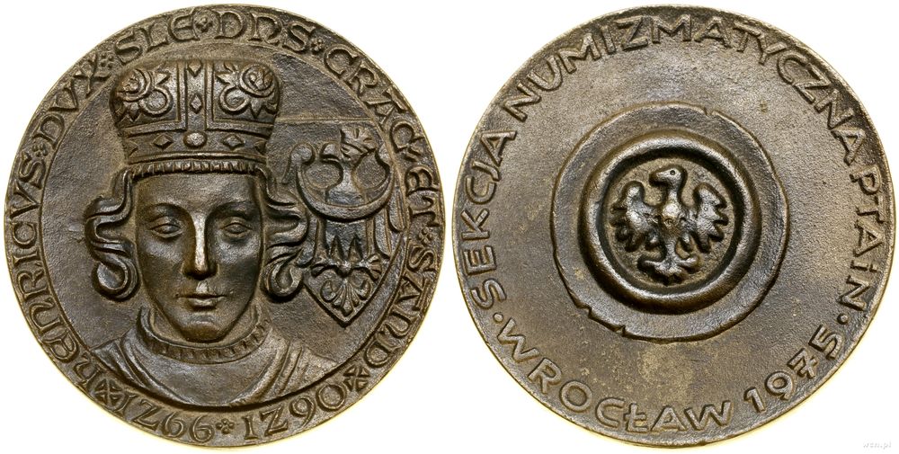 | Opis: | Polska - Polska Rzeczpospolita Ludowa (1952–1989), medal pamiątkowy, 1975, Aw: Głowa Henryka IV Probusa na wprost, z prawej tarcza z herbem Śląska, HENRICVS DVX SLE DNS CRAC ET SAND + 1266 1290 +, Rw: Brakteat śląski, SEKCJA NUMIZMATYCZNA PTAiN • WROCŁAW 1975 • |