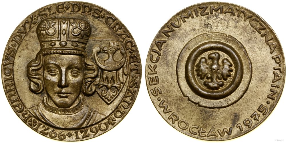 | Opis: | Polska - Polska Rzeczpospolita Ludowa (1952–1989), medal pamiątkowy, 1975, Aw: Głowa Henryka IV Probusa na wprost, z prawej tarcza z herbem Śląska, HENRICVS DVX SLE DNS CRAC ET SAND + 1266 1290 +, Rw: Brakteat śląski, SEKCJA NUMIZMATYCZNA PTAiN • WROCŁAW 1975 • |