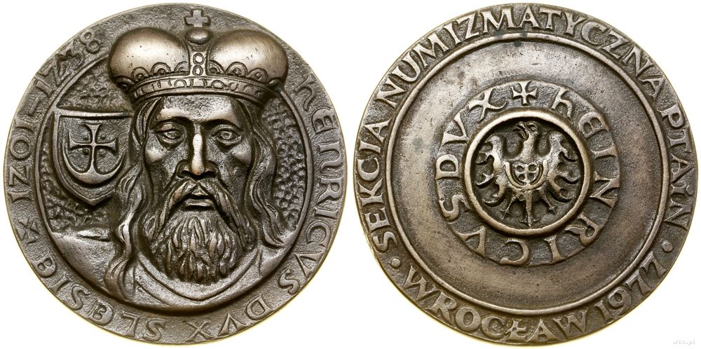 | Opis: | Polska - Polska Rzeczpospolita Ludowa (1952–1989), medal pamiątkowy, 1977, Aw: Głowa Henryka Brodatego na wprost, obok tarcza, HENRICVS DVX SLESIE + 1201–1238, Rw: Moneta, SEKCJA NUMIZMATYCZNA PTAiN • WROCŁAW 1971 |