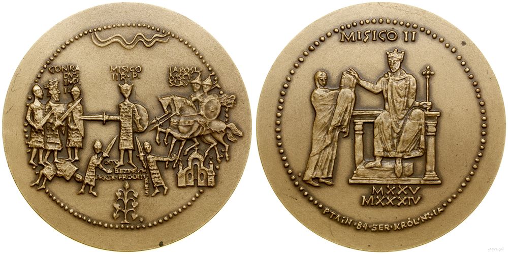 | Opis: | Polska - Polska Rzeczpospolita Ludowa (1952–1989), medal z serii królewskiej PTAiN – Mieszko II, 1984, Warszawa, Aw: Władca w majestacie, z lewej kobieta podająca mu księgę, u góry MISICO II, na dole MXXV / MXXXIV, PTAiN • 84 • SER • KRÓL • Nr • 1A, Rw: Na środku postać króla z mieczem, nad nim MISICO / II R-P., wokół atakujące go postacie, z trzech rycerzy, nad nimi CONRA / DVS / IMP• / II, z prawej dwóch jeźdźców, nad nimi JAROSL / MSCI / SLAV, niżej dwóch rycerzy z boków których martwa postać i fasada kościoła, OTTO / BEZPRYM / FRATR • PRODITO / R / E / S, niżej roślina, projektował Witold Korski |