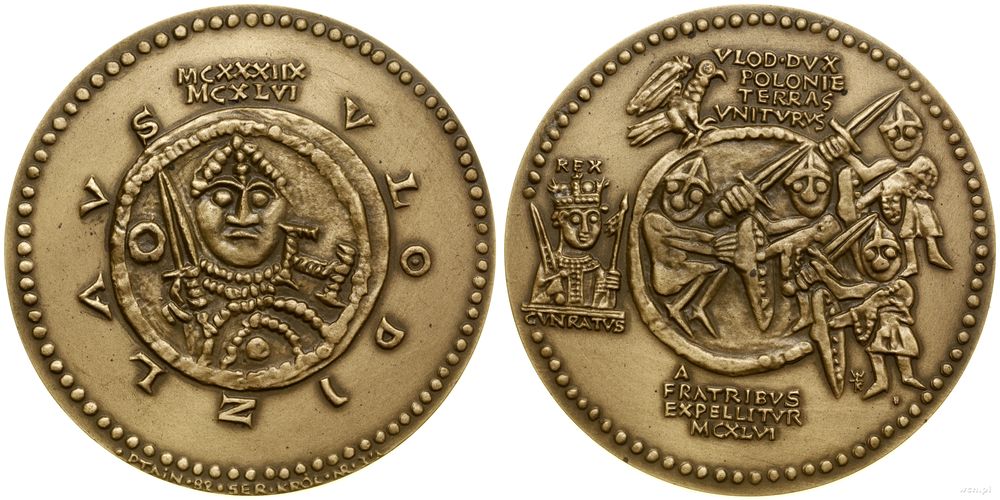 | Opis: | Polska - Polska Rzeczpospolita Ludowa (1952–1989), medal z serii królewskiej PTAiN – Władysław Wygnaniec, 1982, Warszawa, Aw: Awers denara typu książę z mieczem, u góry MCXXXIIX / MCXLVI, VLODIZLAVS, • PTAiN • 82 • SER • KRÓL • NR • 3'A, Rw: Postać atakowana przez trzech zbrojnych, u góry ptak, VLOD • DVX / POLONIE / TERRAS / VNITVRVS, na dole A / FRATRIBVS / EXPELLITVR / MCXLVI, po lewej popiersie z mieczem i proporcem, REX / CVNRATVS, projektował Witold Korski |