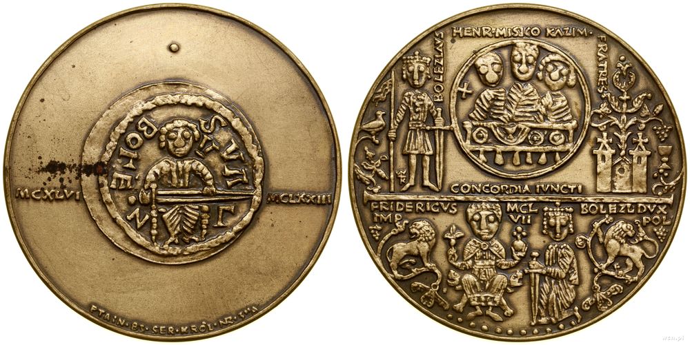 | Opis: | Polska - Polska Rzeczpospolita Ludowa (1952–1989) - Mennica Warszawska, medal z serii królewskiej PTAiN – Bolesław Kędzierzawy, 1983, Warszawa, Aw: Awers denara, po bokach MCXLVI - MCLXXIII, PTAiN • 85 • SER • KRÓL • NR • 3"A, Rw: W górnej części denar typu "trzej książęta za stołem", wyżej BOLEZLAVS HENR • MISICO KAZIM • FRATES, niżej, CONCORDIA IVNCTI, po lewej postać z proporcem i mieczem, po prawej kościół z którego wyrasta winorośl oraz kielich, w dolnej części cesarz w majestacie oraz klęczący książę, po bokach lwy, FRIDERICVS / IMP - MCL / VII - BOLEZL • DVX / POL, projektował Witold Korski |