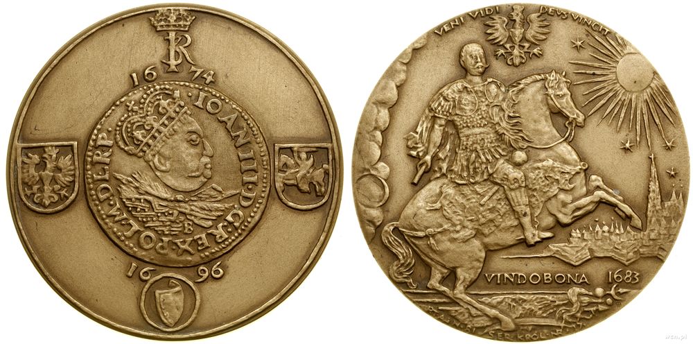 | Opis: | Polska - Polska Rzeczpospolita Ludowa (1952–1989), medal z serii królewskiej PTAiN - Jan III Sobieski, 1981, Warszawa, Aw: Awers szóstaka koronnego z 1685 roku, wokół monogram króla, herby Polski, Litwy i Janina oraz 1674 - 1696, Rw: Król w zbroi na koniu, u góry Orzeł z herbem Janina na piersi, na dole trofea i napis VINDOBONA 1683, VENI VIDI - DEVS VINCIT, PTAiN • 81 • SER • KRÓL • NR • 17, projektował Witold Korski |