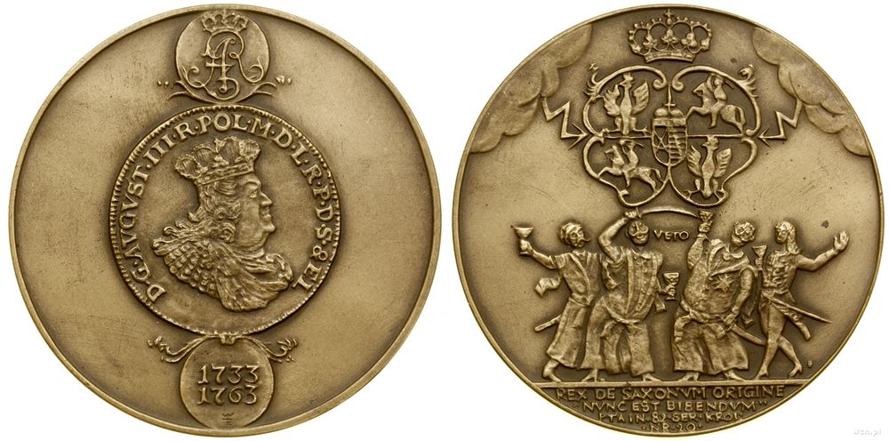 | Opis: | Polska - Polska Rzeczpospolita Ludowa (1952–1989) - Mennica Warszawska, medal z serii królewskiej PTAiN – August III, 1982, Warszawa, Aw: Awers złotówki z 1764 roku, wyżej monogram władcy, niżej 1733 / 1763, Rw: Kartusz z herbem Rzeczypospolitej, w który uderzają dwa pioruny z chmur, niżej grupa postaci z kielichami, między nimi VETO, w odcinku REX DE SAXONVM ORIGINE / "NVNC EST BIBENDVM" / PTAiN • 82 • SER • KRÓL • / • NR • 20 •, projektował Witold Korski |