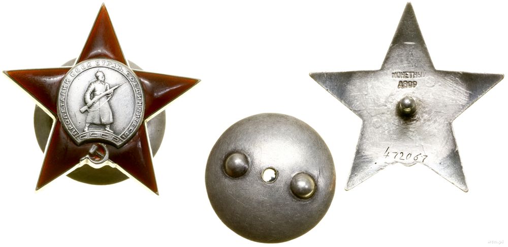 | Opis: | Rosja - ZSRS (1922–1991), Order Czerwonej Gwiazdy (Краснoй Звезды), po 1936, Moskwa, Pięciopromienna gwiazda, emaliowana na czerwono, w dolnej części sierp i młot, w medalionie żołnierz w zimowym mundurze, wokół niego Пролетарии всех стран соединяйтесь i CCCP, na stronie odwrotnej nabita sygnatura МОНЕТНЫЙ ДВОР i wygrawerowany numer 472067, order dwuczęściowy, mocowany na słupek, nakrętka niesygnowana |