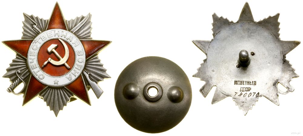 | Opis: | Rosja - ZSRS (1922–1991), Order Wojny Ojczyźnianej (Отечественной войны) I klasy wz. 1985, Moskwa, Pięciopromienna gwiazda emaliowana na czerwono, między ramionami promienie, na tle gwiazdy skrzyżowane karabin i szabla, na środku gwiazdy medalion w którym ОТЕЧЕСТВЕННАЯ ВОЙНА w otoku, w polu skrzyżowane sierp i młot, na stronie odwrotnej sygnatura MOНЕТНЫЙ ДВОР i wygrawerowany numer 740070, mocowany na słupek, nakrętka niesygnowana |