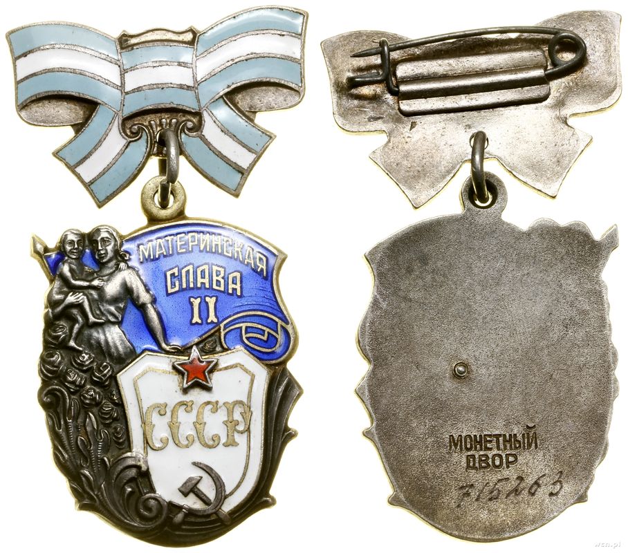| Opis: | Rosja - ZSRS (1922–1991), Order „Macierzyńska sława” II klasy, od 1944, Moskwa, flaga z napisem МАТЕРИНСКАЯ / СЛАВА / II, z lewej postać matki z dzieckiem na ręku, druga ręka opiera się o tarczę, na której znajduje się CCCP, na stronie odwrotnej napis МОНЕТНЫИ ДВОР i numer 715263, odznaka dwuczęściowa, mocowana na przywieszkę |