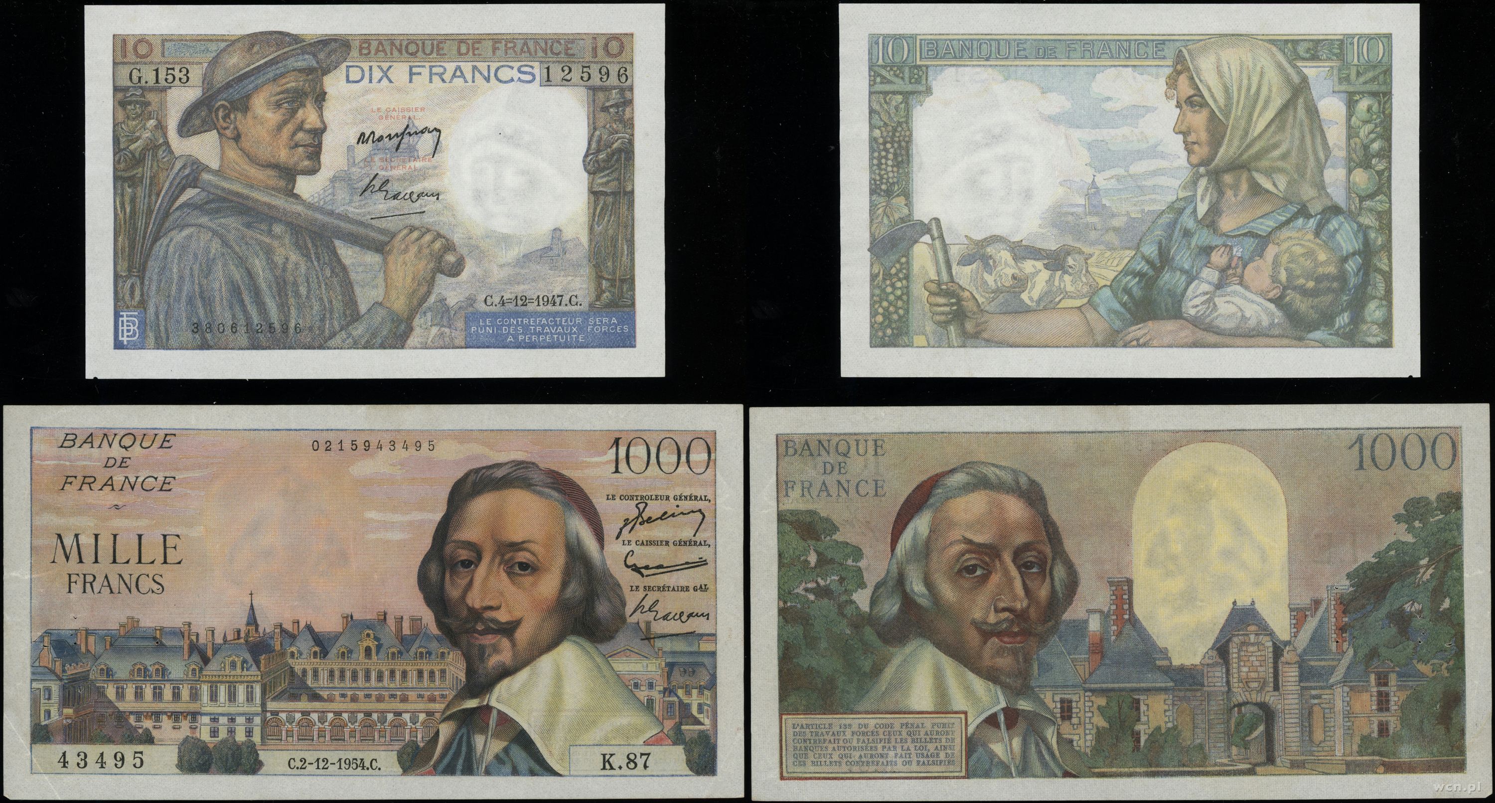1) 10 franków 4.12.1947 seria G 153 (II) 2) 1.000 franków... | II/III |