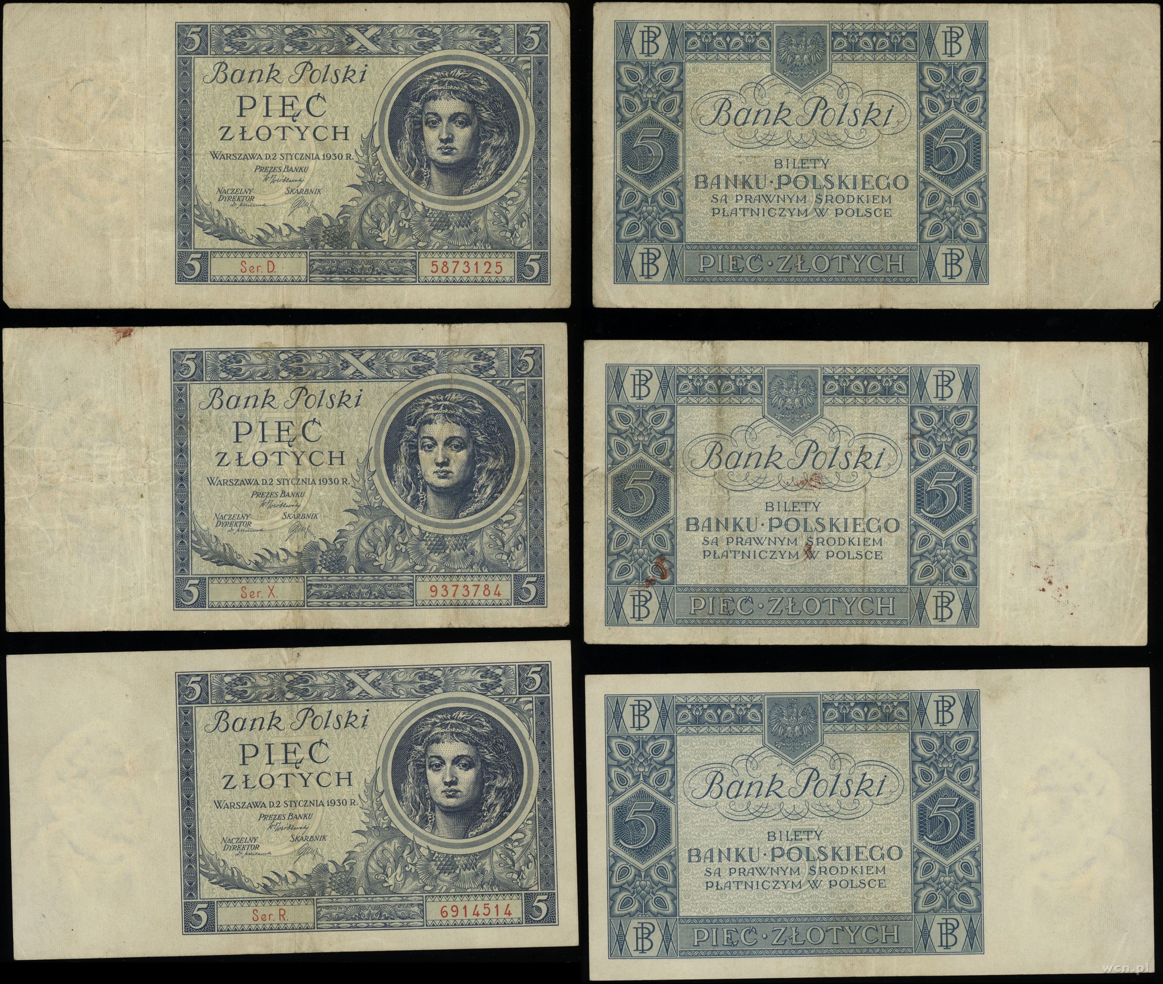 Polska, zestaw: 3 x 5 złotych, 2.01.1930