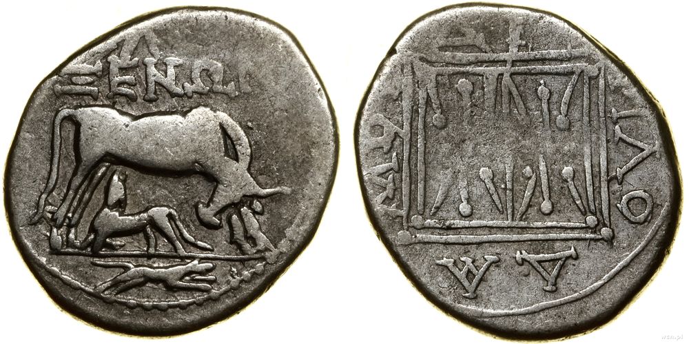 | Opis: | Grecja i posthellenistyczne - Iliria - Dyrrhachium - Xenon i Filodamos, drachma, (ok. 80/70–60/55 pne), Aw: Krowa stojąca w prawo, karmiąca cielę, powyżej napis ΞENΩN, u góry orzeł w prawo, w odcinku pies biegnący w prawo, Rw: Ornamenty kwiatowe w podwójnej kwadratowej ramce, po bokach ΔYP / ΦΙΛΟ / ΔΑ / ΜΟΣ |