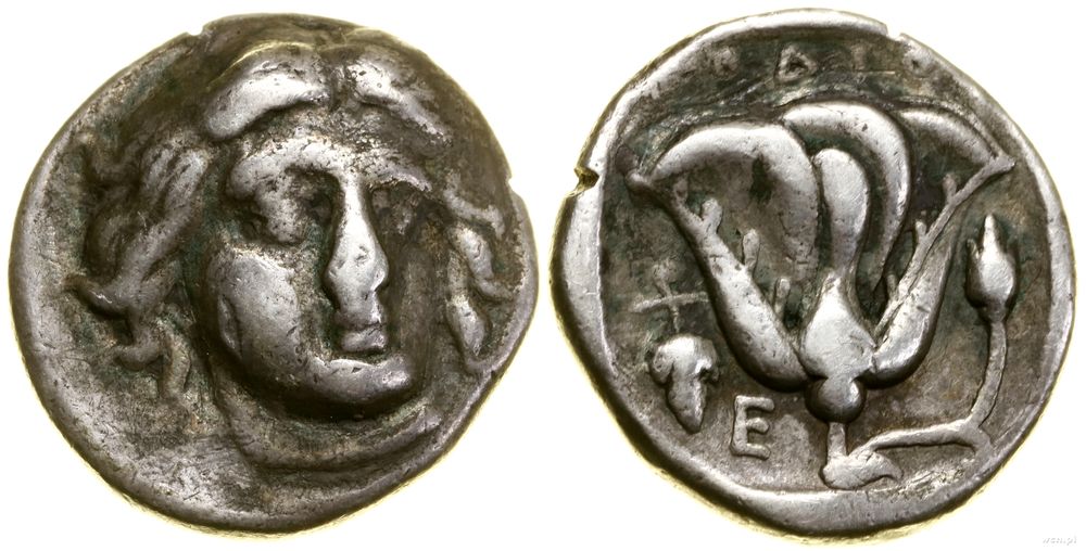 | Opis: | Grecja i posthellenistyczne - Karia - Rodos, didrachma, (ok. 340–316 pne), Aw: Głowa Heliosa trzy-czwarte w prawo, Rw: Kwiat róży na łodydze, z lewej E, u góry POΔION |