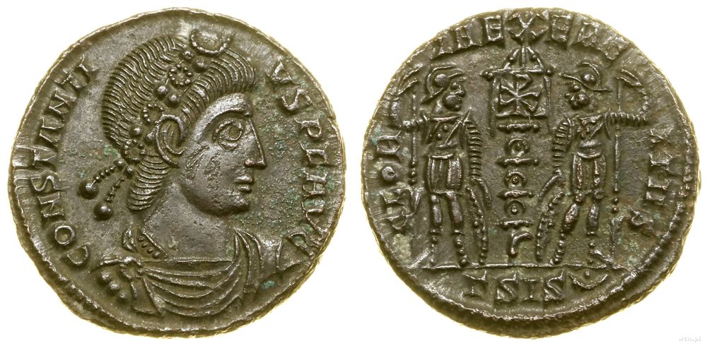 | Opis: | Cesarstwo Rzymskie - Konstancjusz II (324–361), follis, (337–340), Siscia, Aw: Popiersie władcy w prawo, CONSTANTIVS P F AVG, Rw: GLORIA EXERCITVS, w odcinku ΓSIS (półksiężyc) |