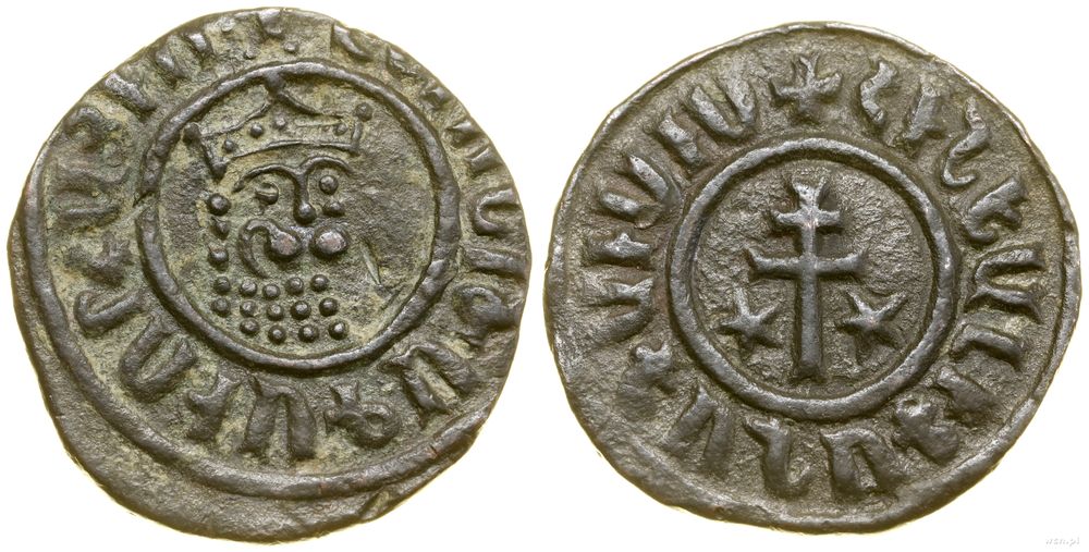 | Opis: | Armenia - Lewon I (1198–1219), tank, (ok. 1198–1219), Aw: Głowa władcy w koronie z sześcioma kropkami na wprost, legenda, Rw: Krzyż patriarchalny, po bokach sześciopromienne gwiazdy, legenda |