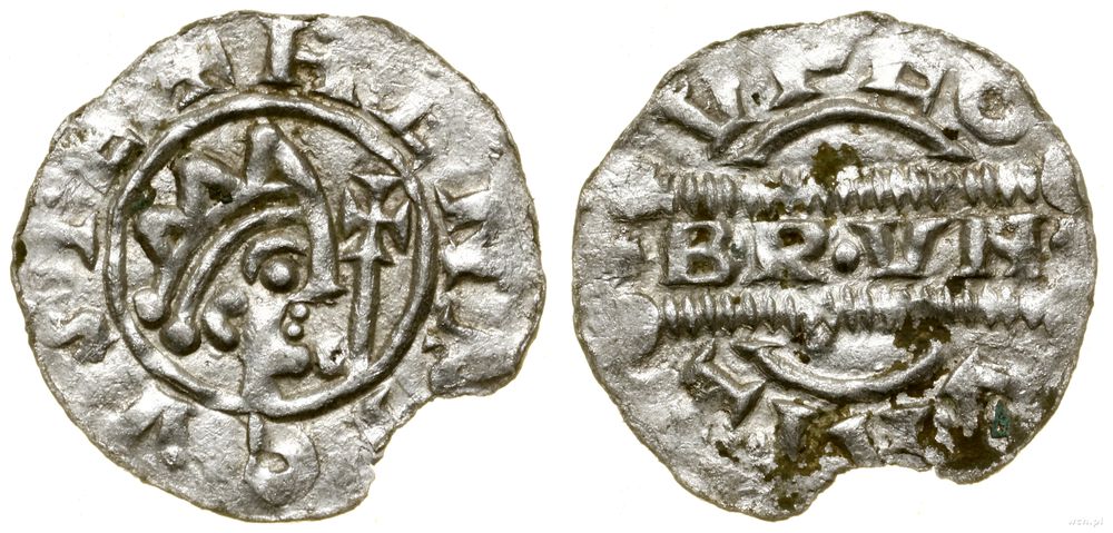 | Opis: | Niderlandy - Fryzja - Margrabia Bruno III (1038–1057), denar, Leeuwarden, Aw: Popiersie cesarza Henryka III w prawo, + HENPICVS PE, Rw: Napis poziomy •BR•VN•, u dołu i góry VPEO - TIVΛ |