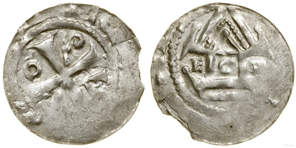 | Opis: | Niemcy - Saksonia - Otto III (983–1002), naśladownictwo denara typu OAP, Aw: Krzyż, w kątach litera A, dłoń, pierścień, pastorał, legenda, Rw: Kapliczka, wewnątrz pierścień, po lewej E, po prawej łuk, legenda |