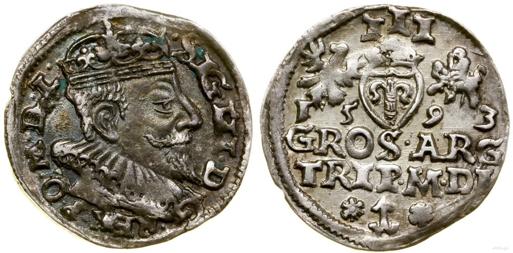 | Opis: | Polska - Zygmunt III Waza (1587–1632) - monety litewskie, trojak, 1593, Wilno, u dołu rewersu herb Chalecki z rozetkami |