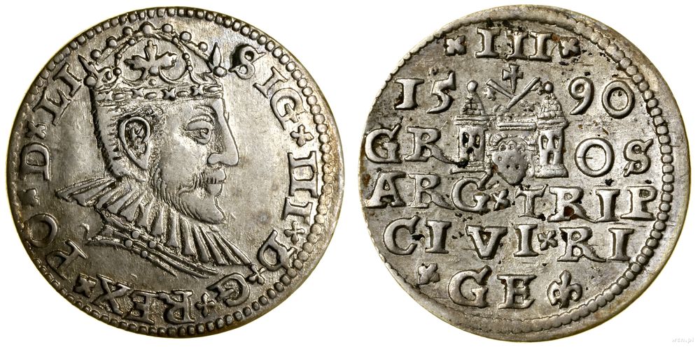| Opis: | Polska - Zygmunt III Waza (1587–1632) - miasto Ryga, trojak, 1590, Ryga, mała głowa króla, interpunkcja w formie X, ale między D a G oraz G a REX krzyże |