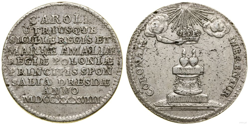| Opis: | Polska - August III (1733–1763) - monety pamiątkowe, dwugrosz (1/12 talara), 1738, Drezno, wybity z okazji ślubu córki Augusta III - Marii Amalii, z władcą Sycylii i Neapolu Karolem IV Sycyliskim (Karolem III Hiszpańskim - późniejszym królem Hiszpanii), Aw: Dziewięciowierszowy napis, Rw: Ołtarz z gorejącymi sercami, nad nimi korona w promieniach słońca, trzymana przez wyłaniającą się z chmur dłoń, w otoku napis CORONAM - MERENTUR |