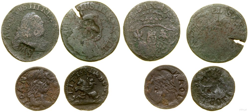 | Opis: | Polska, zestaw 4 monet, 2 x grosz Augusta III (z kontramarkami) oraz 2 x szeląg miedziany Jana Kazimierza (obie monety wybite jednostronnie) |