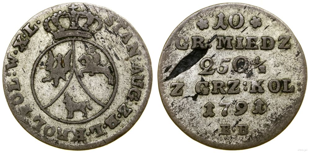 | Opis: | Polska - Stanisław August Poniatowski (1764–1795) - monety koronne, 10 groszy miedziane, 1791 EB, Warszawa |