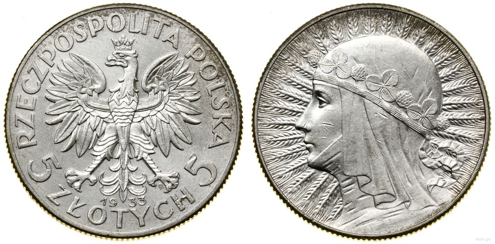 | Opis: | Polska - II Rzeczpospolita Polska (1918–1939) - monety obiegowe, 5 złotych, 1933, Warszawa, głowa kobiety w czepcu |