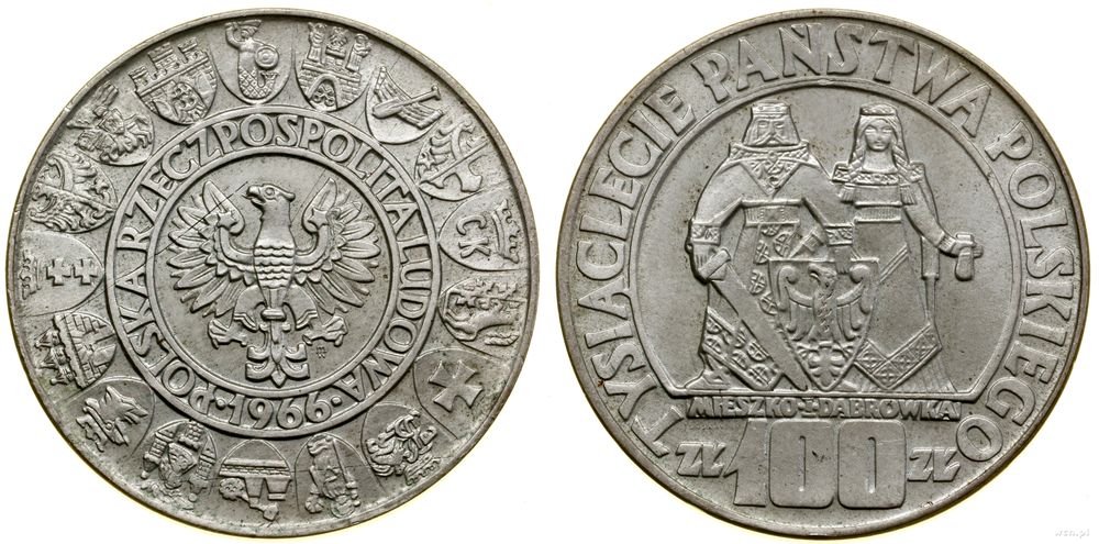 | Opis: | Polska - Polska Rzeczpospolita Ludowa (1952–1989) - monety obiegowe i kolekcjonerskie, 100 złotych, 1966, Warszawa, Tysiąclecie Państwa Polskiego – Mieszko i Dąbrówka |