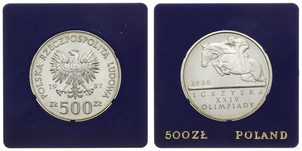 | Opis: | Polska - Polska Rzeczpospolita Ludowa (1952–1989) - monety obiegowe i kolekcjonerskie, 500 złotych, 1987, Warszawa, Igrzyska XXIV Olimpiady 1988 – jeździec na koniu |