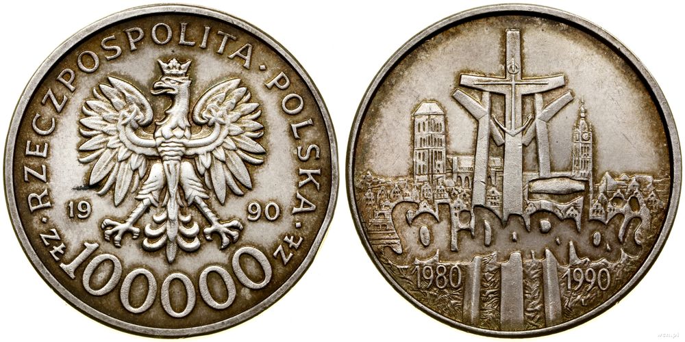 | Opis: | Polska - III Rzeczpospolita Polska (od 1989) - monety obiegowe, 100.000 złotych, 1990, USA, Solidarność 1980–1990, /typ B/, na awersie ZŁ blisko nominału, bez litery L na rewersie |