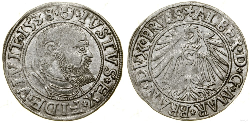 | Opis: | Prusy Książęce (1525–1657) - Albert Hohenzollern (1525–1568), grosz, 1538, Królewiec, końcówka legendy rewersu PRVSS |