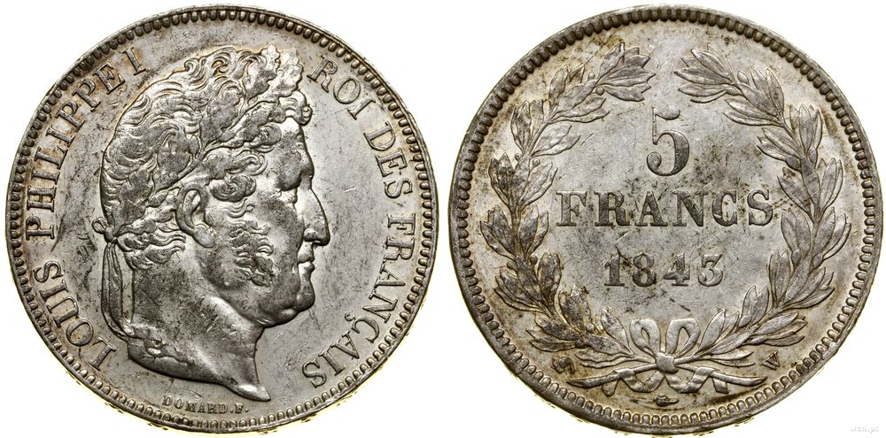 | Opis: | Francja - Ludwik Filip I (1830–1848), 5 franków, 1843 W, Lille |