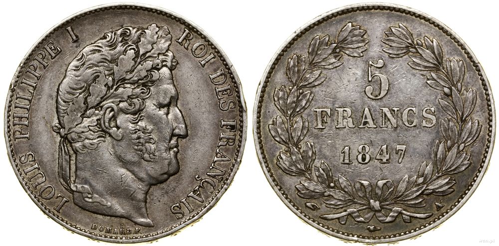 | Opis: | Francja - Ludwik Filip I (1830–1848), 5 franków, 1847 A, Paryż |
