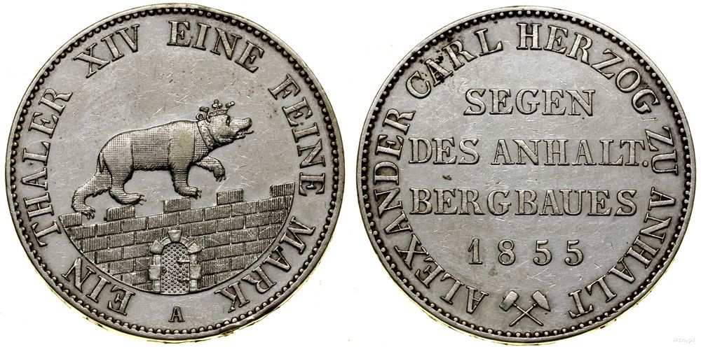 | Opis: | Niemcy - Anhalt - Bernburg - Aleksander Karol (1834–1863), talar górniczy (Ausbeutetaler), 1855 A, Berlin |