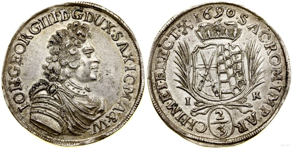 | Opis: | Niemcy - Saksonia - linia albertyńska (1547–1918) - Jan Jerzy III (1680–1691), 2/3 talara (gulden), 1690 IK, Drezno, odmiana z DUX w legendzie awersu |