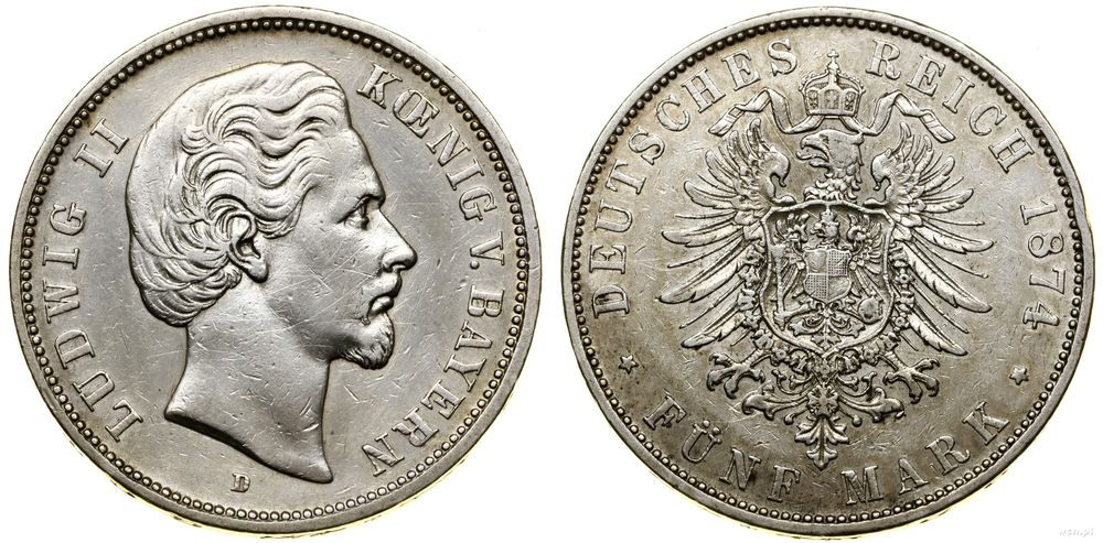 | Opis: | Niemcy - Bawaria - Ludwik II (1864–1886) - system markowy, 5 marek, 1874 D, Monachium |