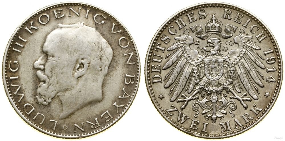 | Opis: | Niemcy - Bawaria - Ludwik III (1913–1918), 2 marki, 1914 D, Monachium |