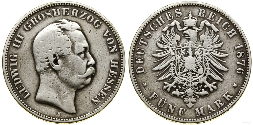 | Opis: | Niemcy - Hesja - Darmstadt - Ludwik III (1848–1877), 5 marek, 1876 H, Darmstadt |