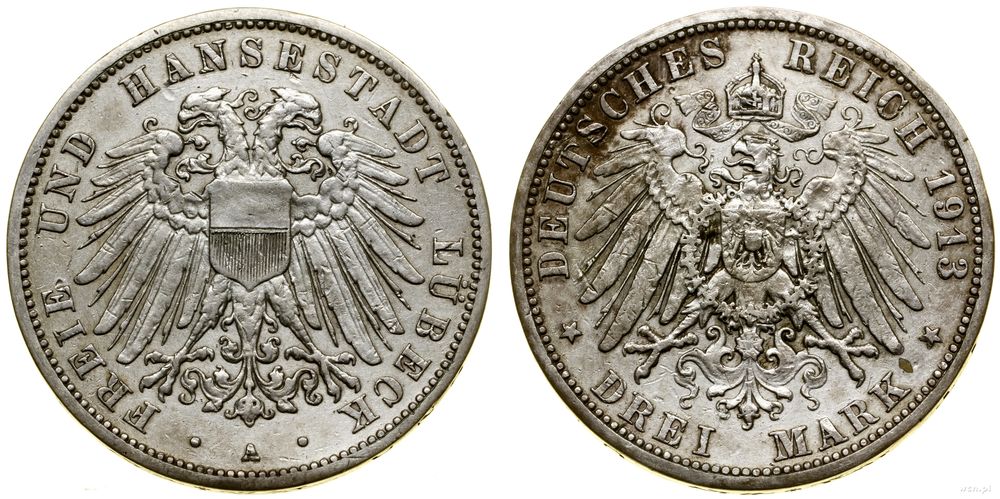 | Opis: | Niemcy - Lubeka – miasto, 3 marki, 1913 A, Berlin |