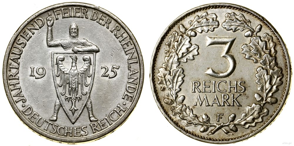 | Opis: | Niemcy - Republika Weimarska (1918–1933), 3 marki, 1925 F, Stuttgart, 1.000-lecie przyłączenia Nadrenii do Niemiec |