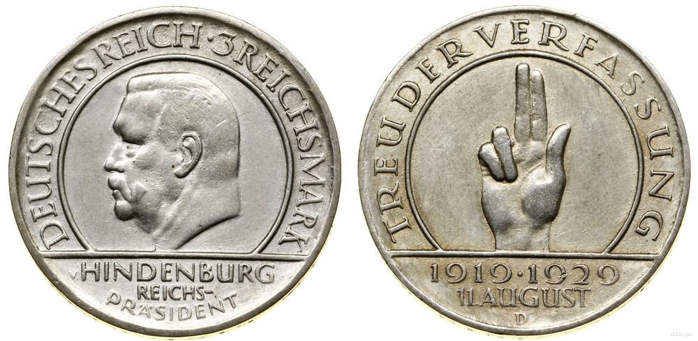 | Opis: | Niemcy - Republika Weimarska (1918–1933), 3 marki, 1929 D, Monachium, 10. lecie Przysięgi Weimarskiej |