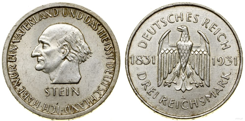 | Opis: | Niemcy - Republika Weimarska (1918–1933), 3 marki, 1931 A, Berlin, 100. rocznica śmierci Freiherra von Stein |