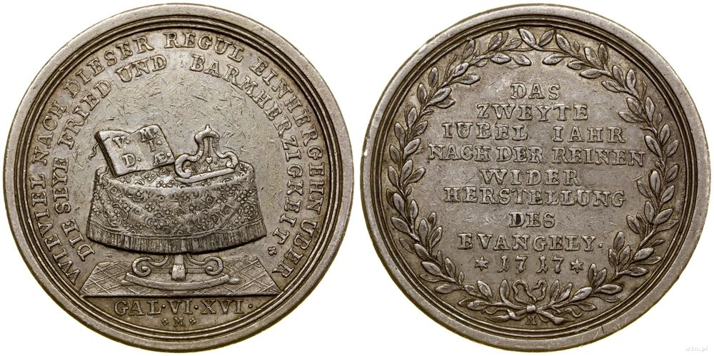 | Opis: | Niemcy - Norymberga, medal na 200-lecie reformacji, 1717, Aw: Na stole pokrytym obrusem biblia i pion murarski, legenda, Rw: W wieńcu legenda w dziewięciu wersach |