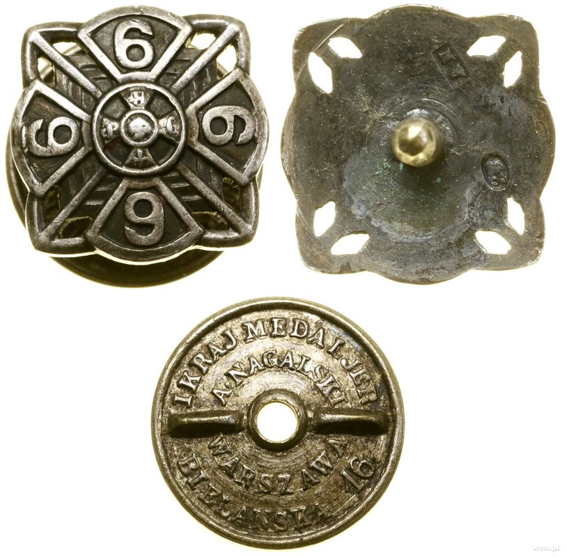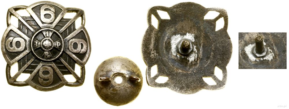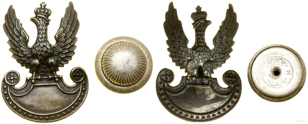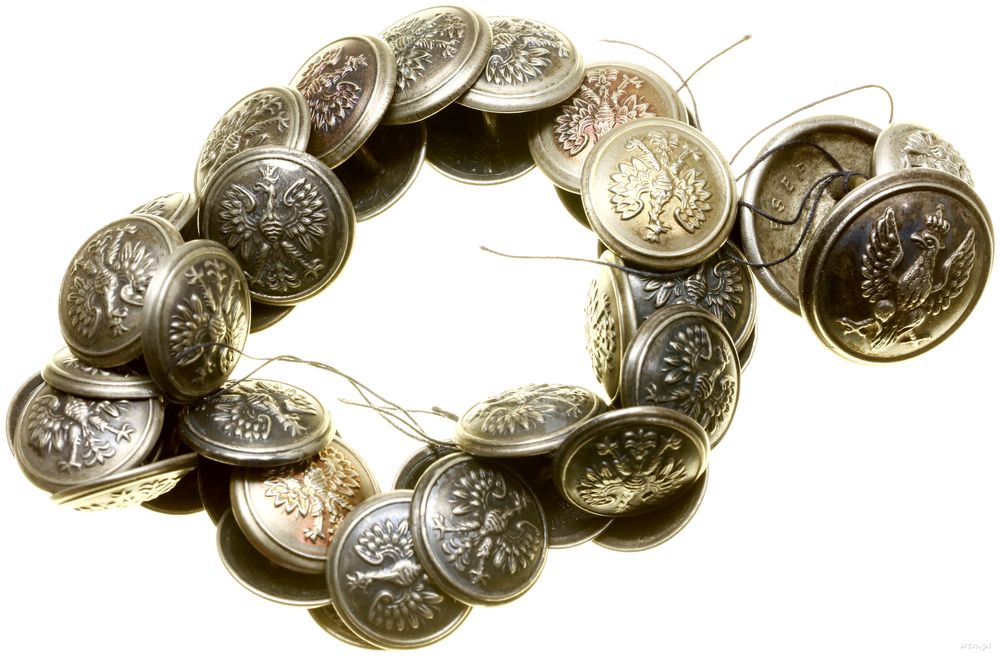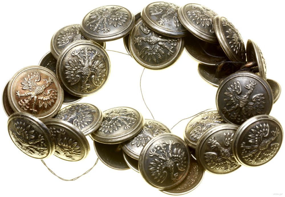 | Opis: | Polska, zestaw pamiętek wojskowych po kpt. Stanisławie Ziembie z Wilna, w skład zestawu wchodzą: 1. odznaka 6 Pułk Piechoty Legionów Józefa Piłsudskiego, Wilno wzór 2 od 1929 roku - naprawiany słupek, nakrętka nieoryginalna, brązsrebrzony i oksydowany, 32.4 mm x 32.3 mm, 13.86 g 2. miniatura odznaki 6 Pułku Piechoty Legionów Józefa Piłsudskiego, Wilno, z oryginalnym słupkiem i nakrętką A, NAGALSKI / WARSZAWA, srebro, 15.7 x 15.7 mm, 2.77 g, na stronie odwrotnej punce) 3. guziki wz. 28 - mundurowe, 30 sztuk (średnica ok. 22 mm) oraz guziki płaszczowe 37 sztuk (średnica ok. 16 mm) 4. guziki wz. 27 - mundurowe (2 szt), guzik płaszczowy (1 szt) 5. Orzeł do czapki wz. 19, mocowany na słupek, nakrętka sygnowana Z.S, mosiądz srebrzony, 59.7 x 44.0 mm, 14.94 g |