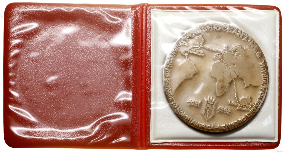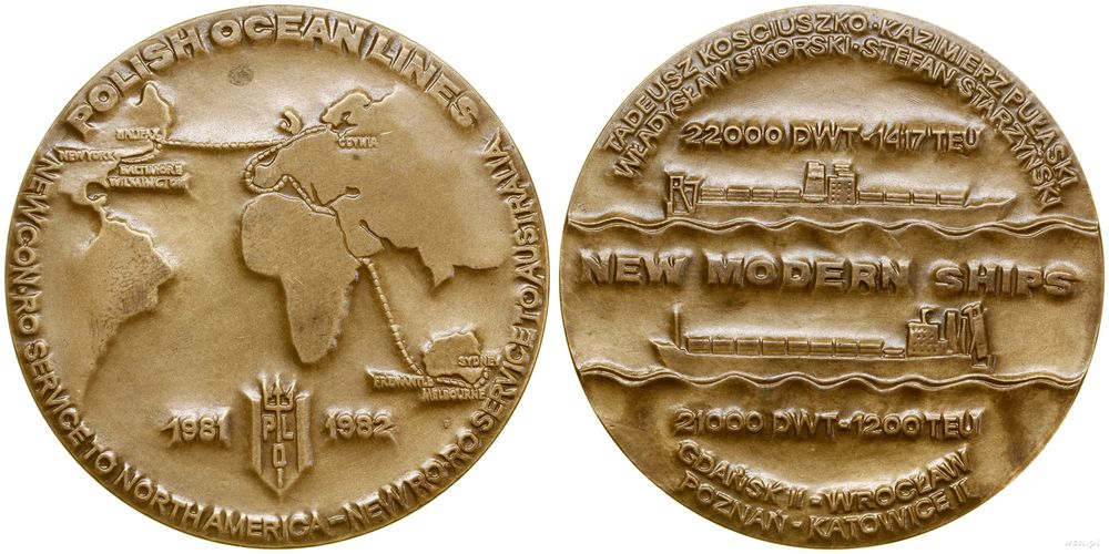 | Opis: | Polska - Polska Rzeczpospolita Ludowa (1952–1989), Polish Ocean Lines, 1982, Warszawa, Aw: Fragment kuli ziemskiej z zaznaczonymi trasami PLO, niżej logo PLO, po bokach 1981 - 1982, POLISH OCEAN LINES - NEWCON-RO SERVICE TO NORTH AMERICA – NEWRO-RO SERVICE TO AUSTRALIA, Rw: Dwa kontenerowce, między nimi NEW MODERN SHIPS, u góry TADEUSZ KOŚCIUSZKO • KAZIMIERZ PUŁASKI / WLŁADYSŁAW SIKORSKI • STEFAN STARZYŃSKI / 22000 DWT - 1417 TEU, na dole 21000 DWT - 1200 TEU / GDAŃSK II - WROCLAW / POZNAŃ - KATOWICE II, projektował i wykonał Piotr Gawron |