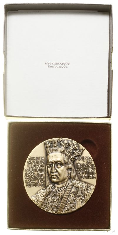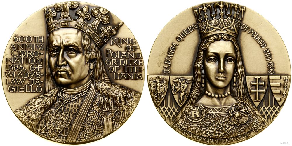 | Opis: | Polska - medale Polonii po II wojnie światowej, 600. rocznica koronacji Władysława Jagiełły, 1987, Danbury, Aw: Ukoronowane popiersie lekko w lewo, po lewej 600TH/ ANNIV. / CORO- / NATION / 1386, OF / WLADYS- / LAW JA- / GIELLO, po prawej KING / OF / POLAND / GR• DUKE / OF LITH- / UANIA, Rw: Ukoronowane popiersie na wprost, po bokach cztery tarcze herbowe, na przecięciu popiersia POLISH AMERICAN NUMISM • ASSOC • 1986, JADWIGA QUEEN - OF POLAND 1384•1399, Obrzeże: © 1987 MEDALLIC ART CO. – DANBURY, CT. – BRONZE |