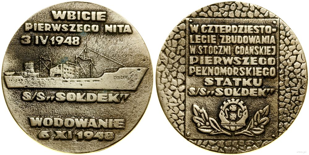| Opis: | Polska - Polska Rzeczpospolita Ludowa (1952–1989), medal pamiątkowy, 1988, Aw: WBICIE / PIERWSZEGO NITA / 3 IV 1948, niżej statek w prawo, niżej S/S/ "SOŁDEK" / WODOWANIE / 6 XI 1948, Rw: Plakieta, w której W CZTERDZIESTO- / LECIE ZBUDOWANIA / W STOCZNI GDAŃSKIEJ / PIERWSZEGO / PEŁNOMORSKIEGO / STATKU / S/S "SOŁDEK", niżej logo stoczni gdańskiej |